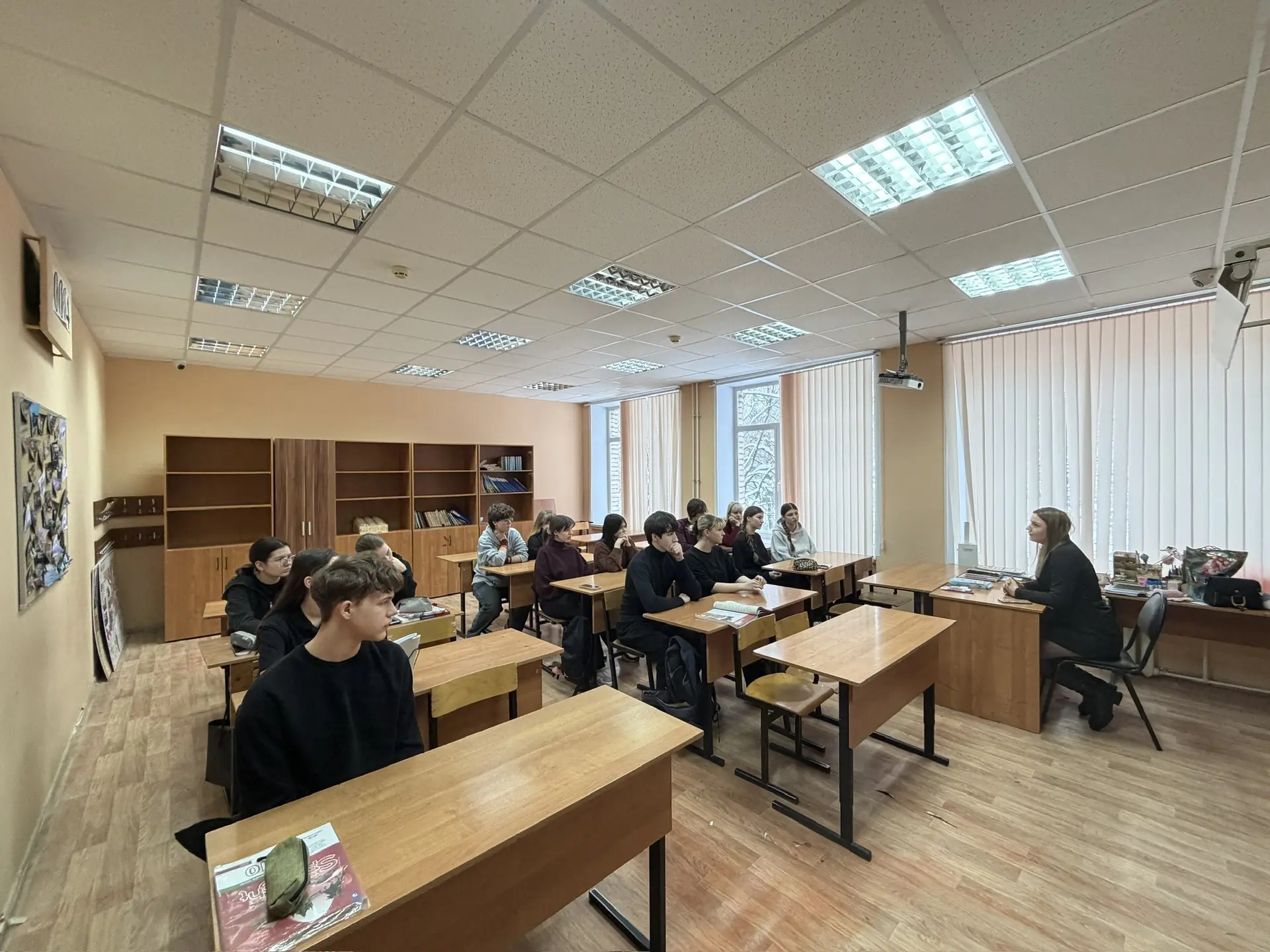 А уважаемая гостья школы является активным волонтером, она организует сбор и доставку гуманитарной помощи на фронт. И рассказала ребятам, что каждая детская открытка, каждая посылка с теплыми вещами придает бойцам силы и веру в то, что их дело правое.