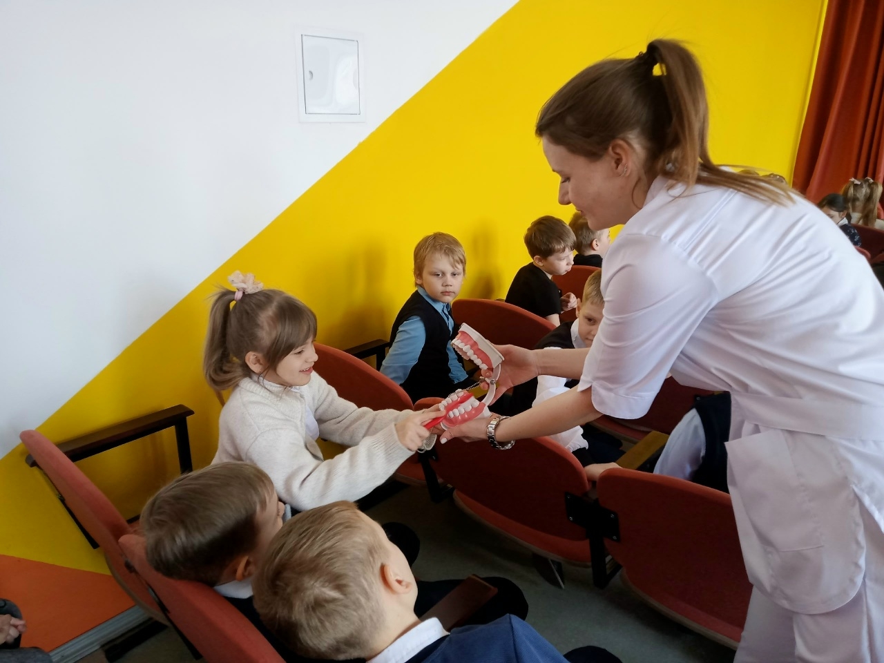 После беседы каждый ученик получил памятный подарок, содержащий зубную щетку, пасту и рекомендации по уходу за зубами.