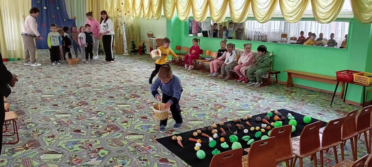 Также дошколята приняли участие в весёлых эстафетах, собрали богатый урожай овощей прямо с грядки и даже построили настоящее овощехранилище, которое станет домом для собранных плодов.