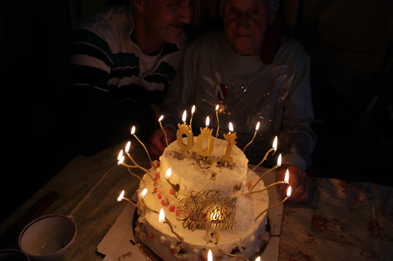 Праздничный обед по случаю столетнего юбилея жительницы села Богословское завершился вручением подарка, специально приготовленного к этому дню её правнучкой - двухэтажного торта, украшенного бордовыми розами и белыми хризантемами.