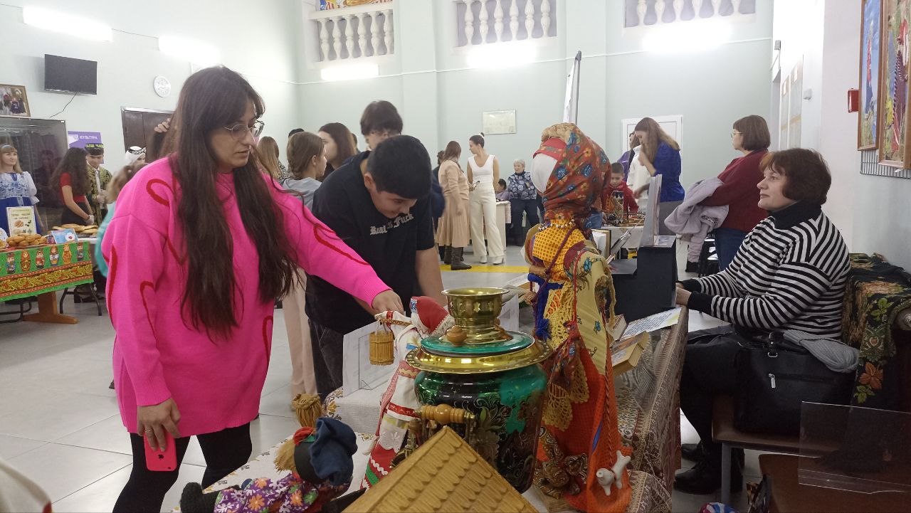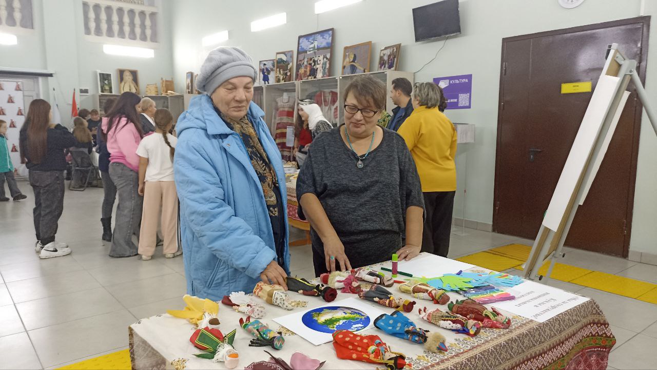 Кто-то рассматривает картины на тему природы родного края, представленные преподавателями и учащимися Ясногорской детской школы искусств им. М.П. Мусоргского, кто-то любуется куклами в национальных костюмах народах России и расспрашивает о подробностях нарядов, кто-то размышляет над вопросами выставки-викторины «Сила в правде и единстве», подготовленной сотрудниками Ясногорской библиотеки им. В.В. Вересаева.