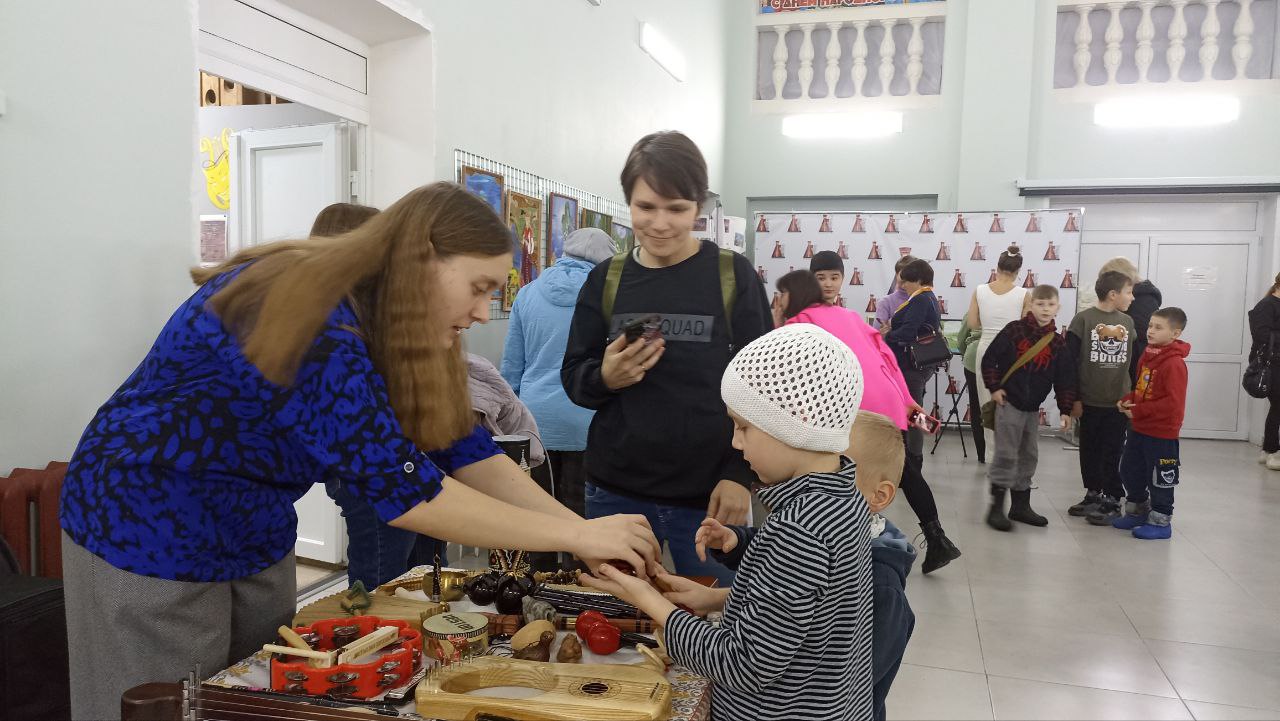 Явный интерес у взрослых и юных ясногорцеввызывают гусли, трещотки, флейта дождя, калимба, гром и другие народные инструменты разных стран. Тем более, что участники мероприятия могут даже взять все эти предметы в руки, попробовать сыграть на них или хотя бы извлечь хоть какие-то звуки. Педагог общеобразовательной средней школы № 3 им. С.В. Ишеева Евгения Баранова показывает желающим, как это сделать.