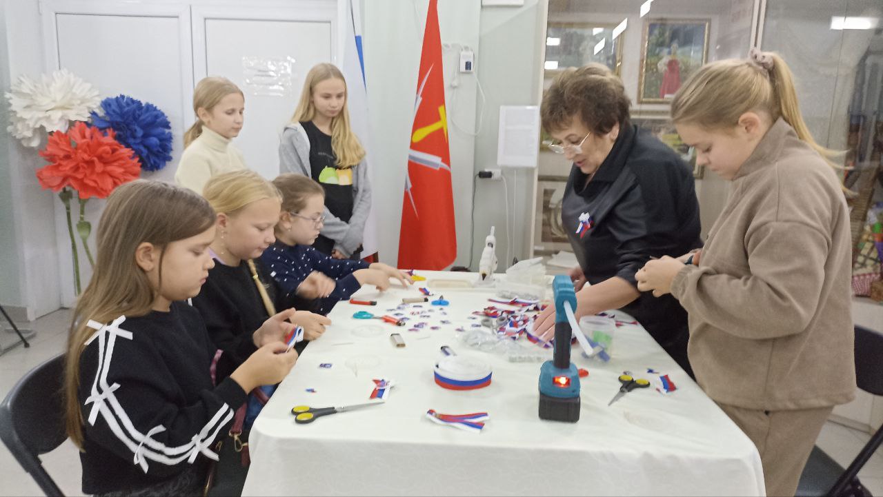 Ясногорские ребятишки спешат поучаствовать в мастер-классе по изготовлению броши триколор, и получается у детей отлично!