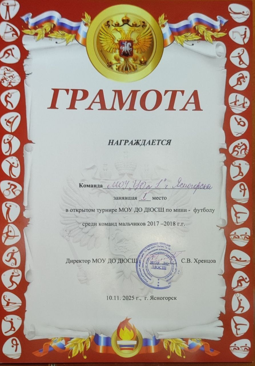 Команда мальчиков 2017-2018 г.р. - учащихся центра образования № 1 - заняла первое место в открытом турнире Детско-юношеской спортивной школы по мини-футболу.