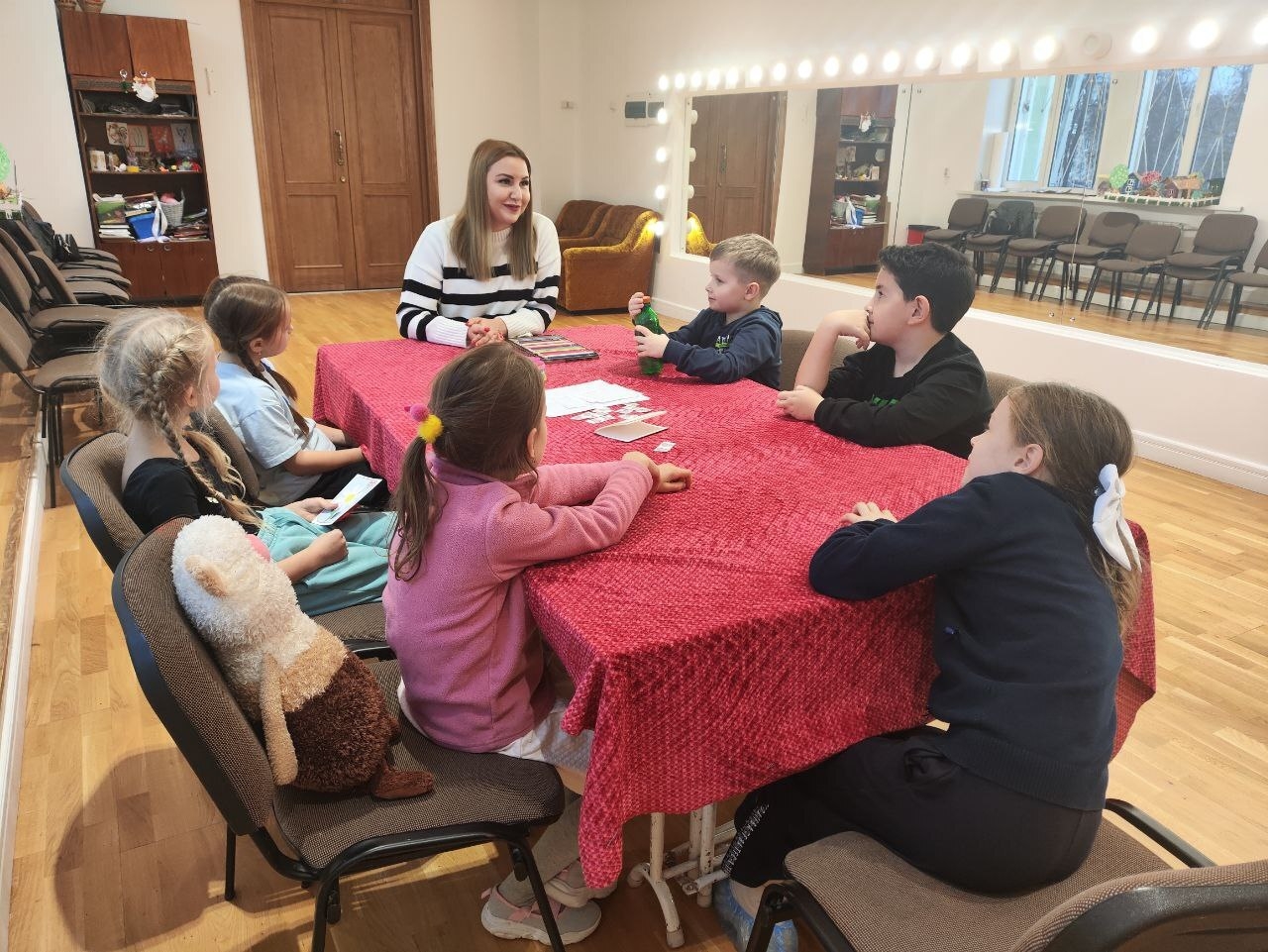 Ребята с удовольствием пообщались со Светланой Сергеевной, задали ей вопросы о том, сложно ли быть мамой, поздравили с наступающим праздником и вручили яркие подарки с просьбой передать их мамам и женам защитников нашей Родины.