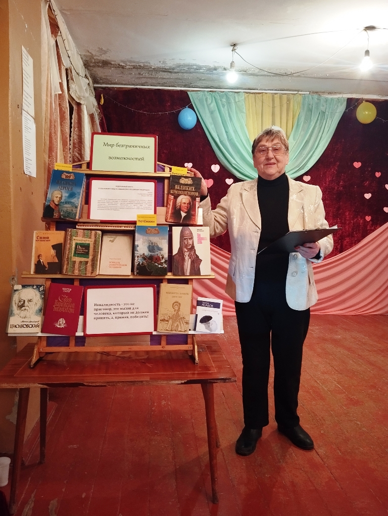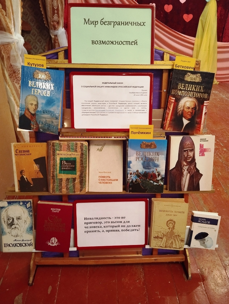 К мероприятию подготовлена книжная выставка "Мир безграничных возможностей", где представлены: исторический роман Виктора Гюго «Собор Парижской Богоматери», повесть русского писателя Владимира Короленко "Слепой музыкант ", "Повесть о настоящем человеке" Бориса Полевого и другие художественные произведения разных авторов.