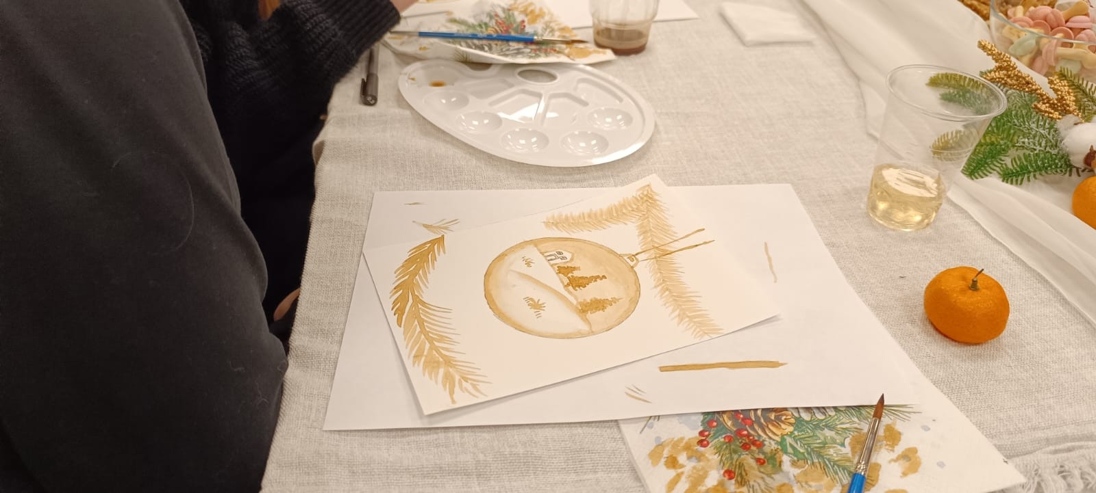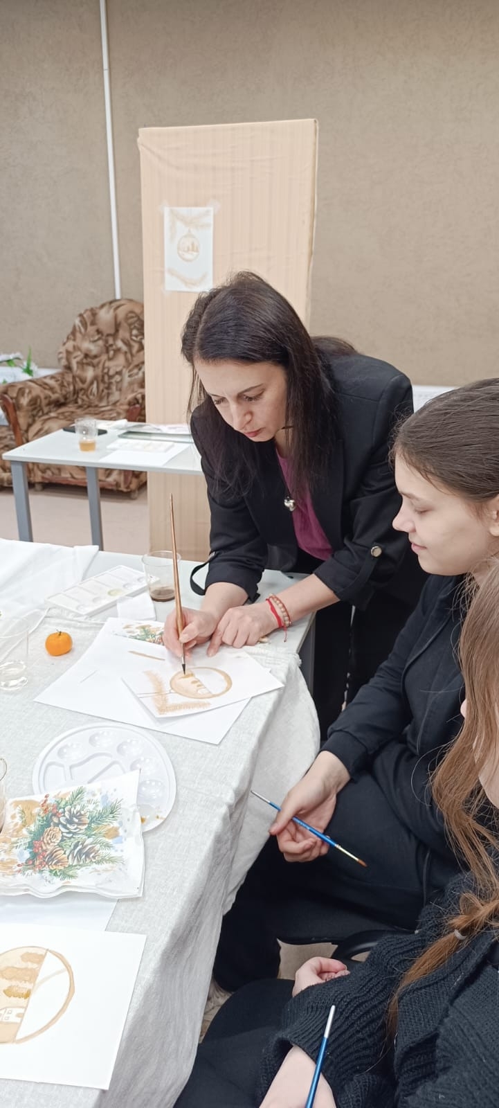 На занятии участники изучили технику гризайль — способ создания зимнего пейзажа с использованием одной краски разных оттенков и белого цвета.