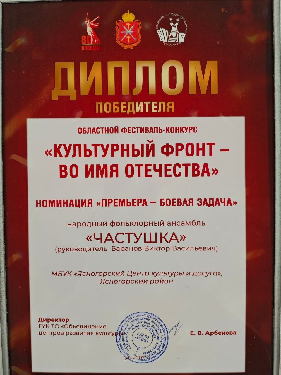 В номинации «Премьера – боевая задача» диплом победителя за глубокое художественное осмысление и яркое воплощение тем патриотизма вручена народному фольклорному ансамблю «Частушка» Ясногорского центра культуры и досуга.