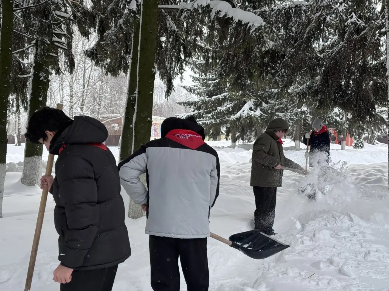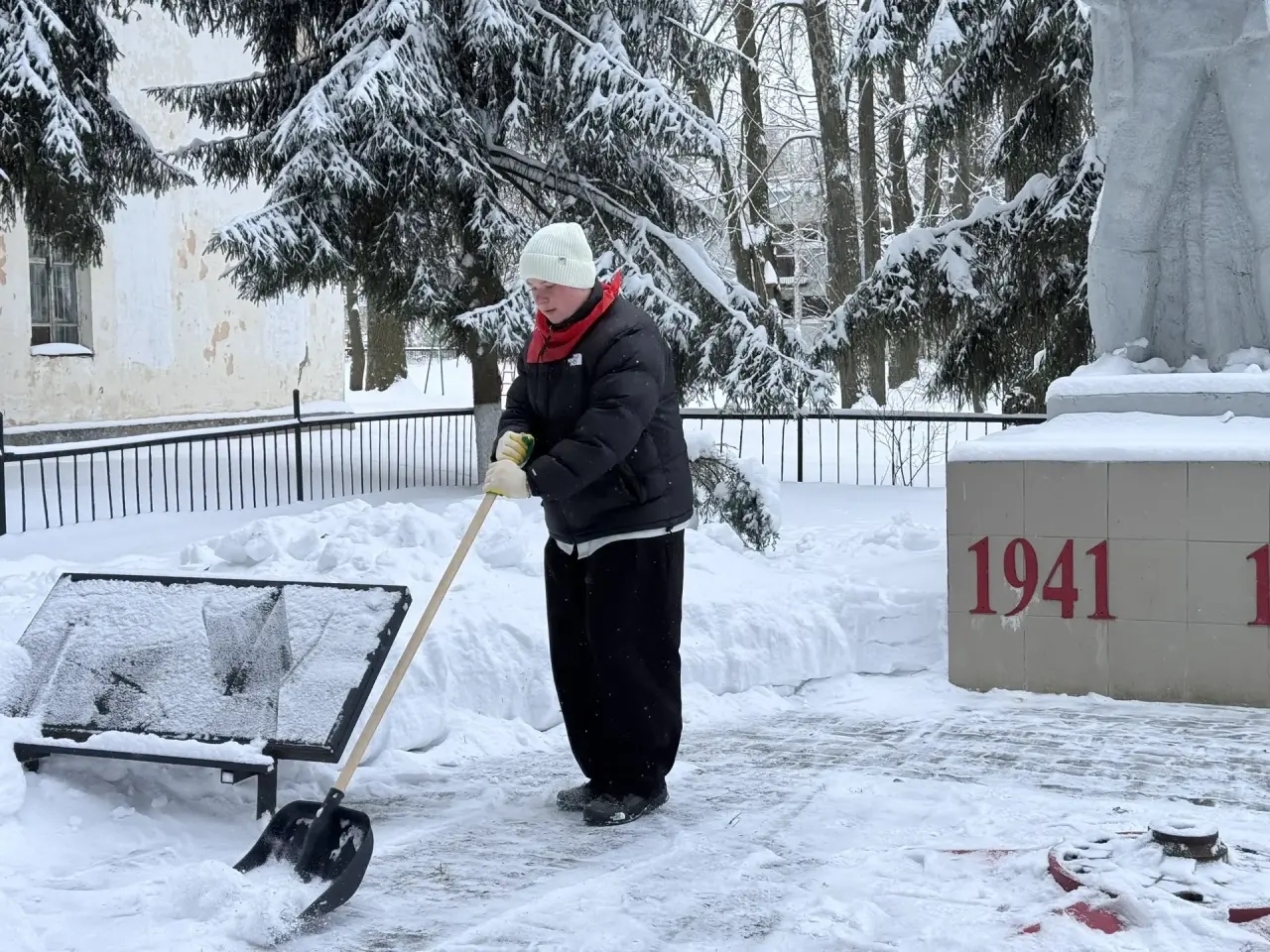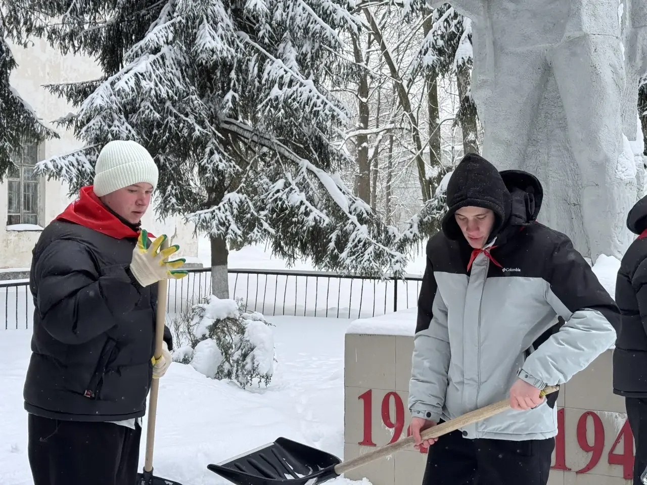 Несмотря на холодную погоду, школьники дружно трудились над расчисткой снега вокруг мемориала.